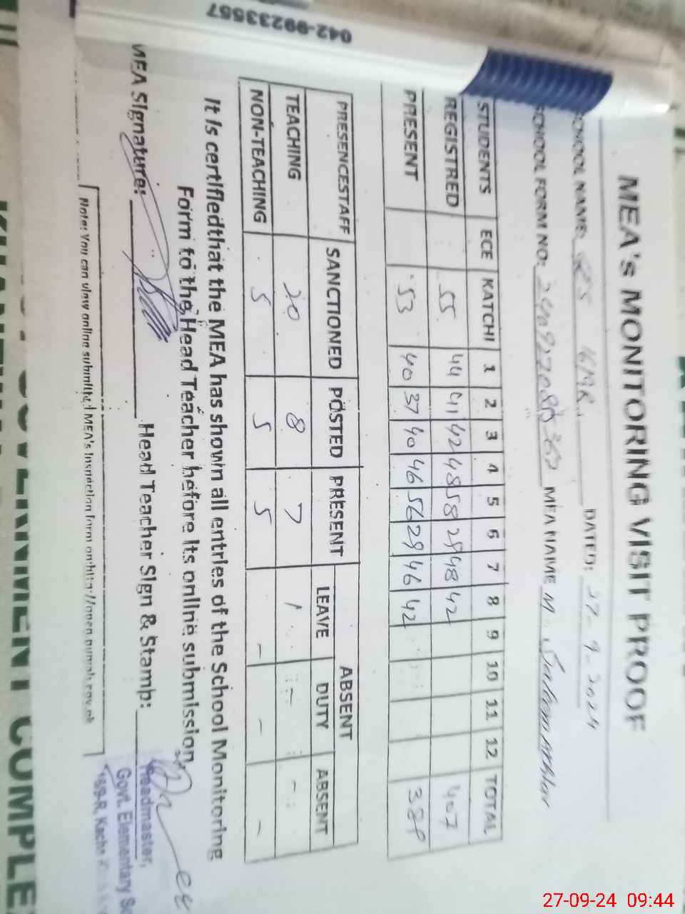 | Attendance Register | Head Teacher | MEA with School | Visit Proof |