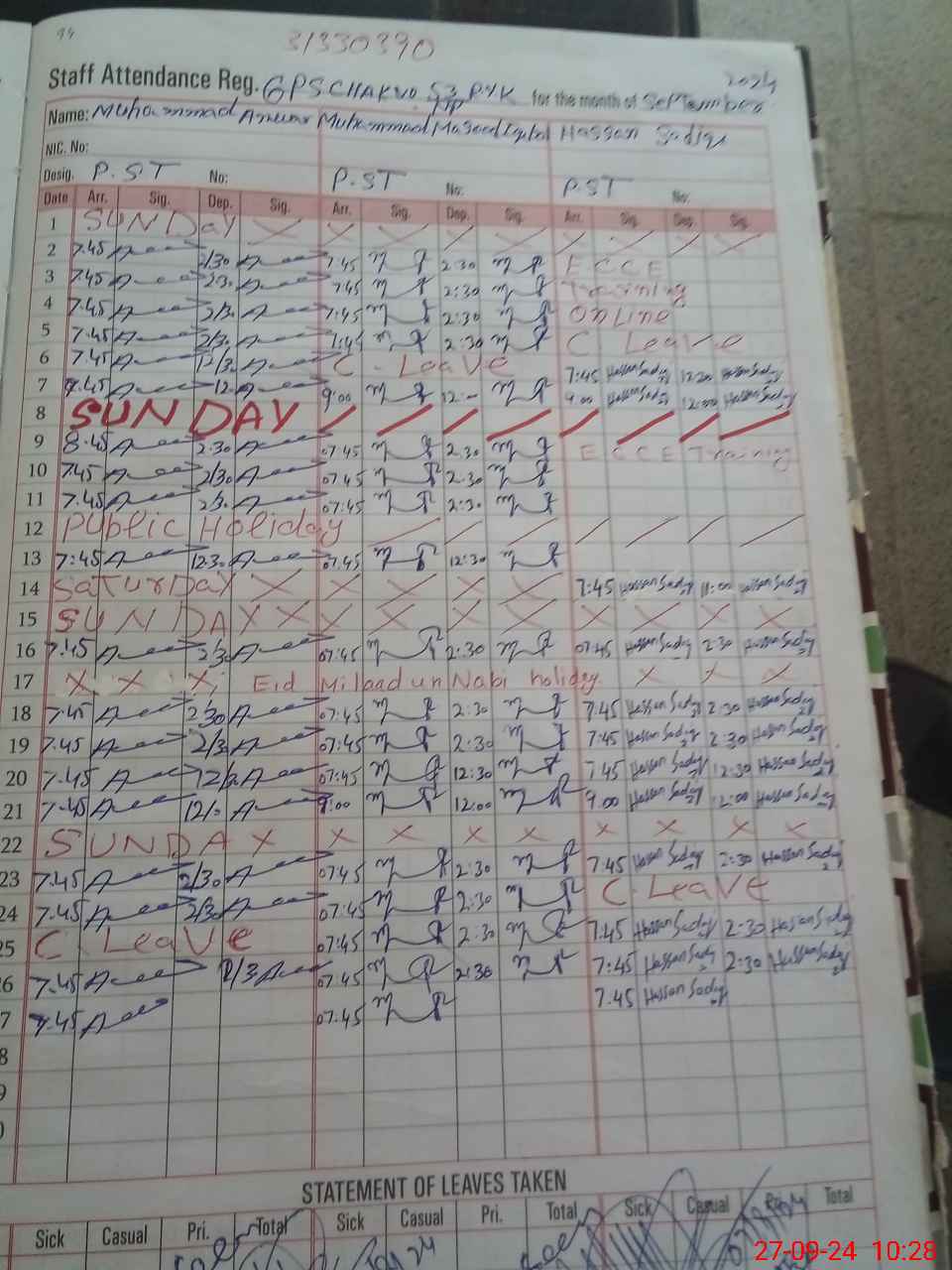 | Name: Mu**** Ma**** Iq**** Designation: (School Headmaster's/Headmistress's) PST Phone/Cell Number: 03**** |