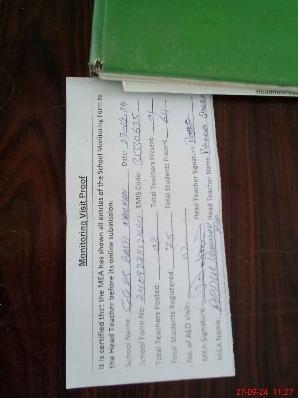 | Attendance Register | Head Teacher | MEA with School | Visit Proof |