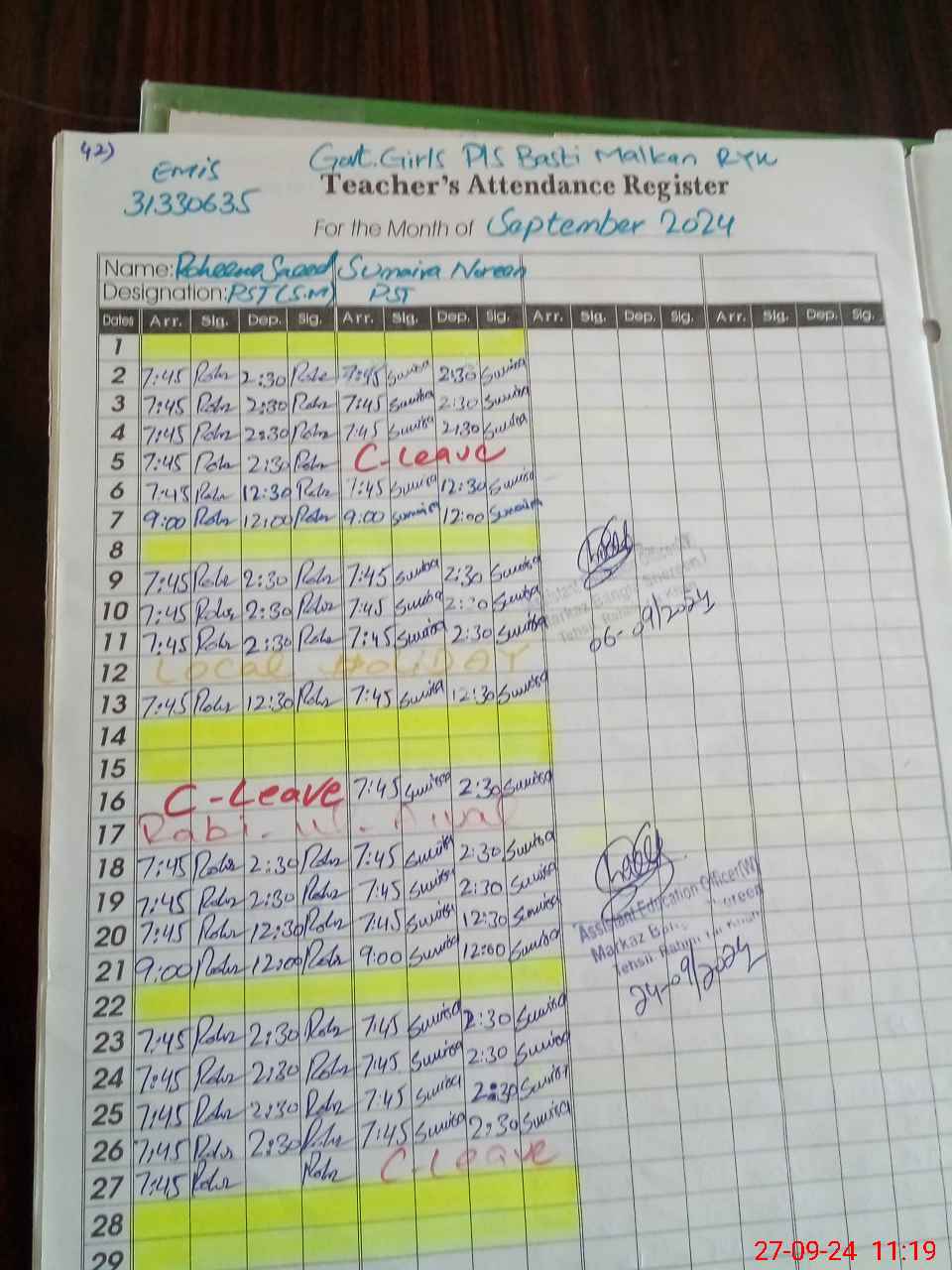 | CNIC | Full Name | Designation | R/C | Absence during last cal. month |