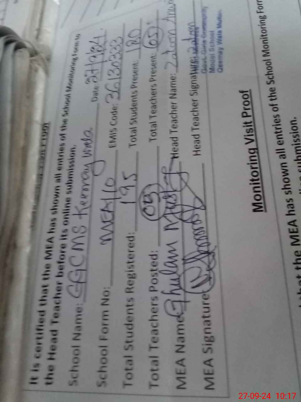 | Attendance Register | Head Teacher | MEA with School | Visit Proof |