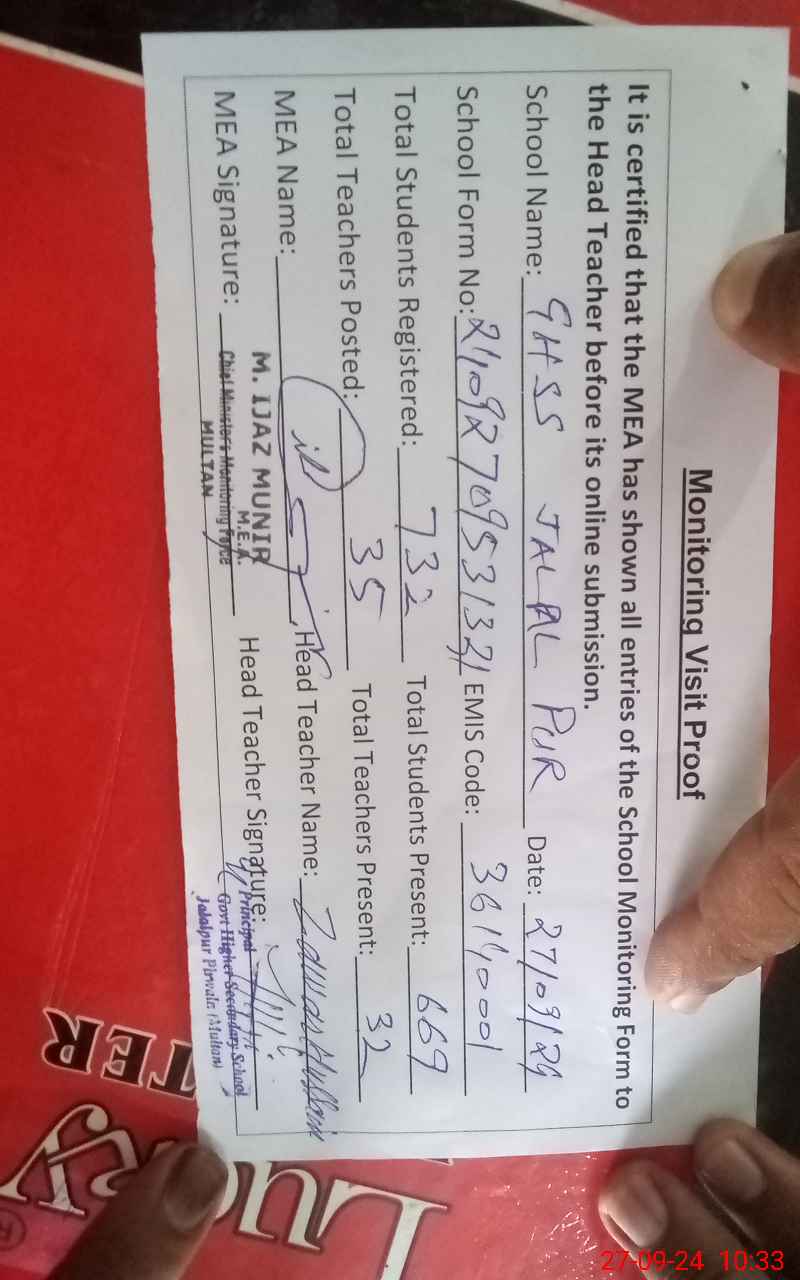 | EMIS Code: 36140001 | Name of School: GHSS JALALPUR PIRWALA | |||