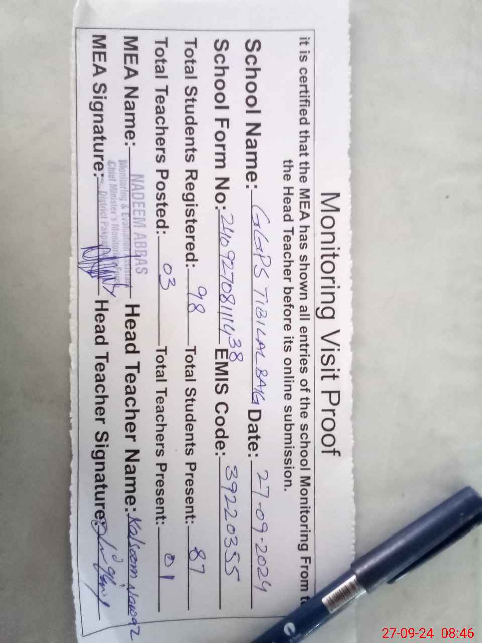 | Attendance Register | Head Teacher | MEA with School | Visit Proof |