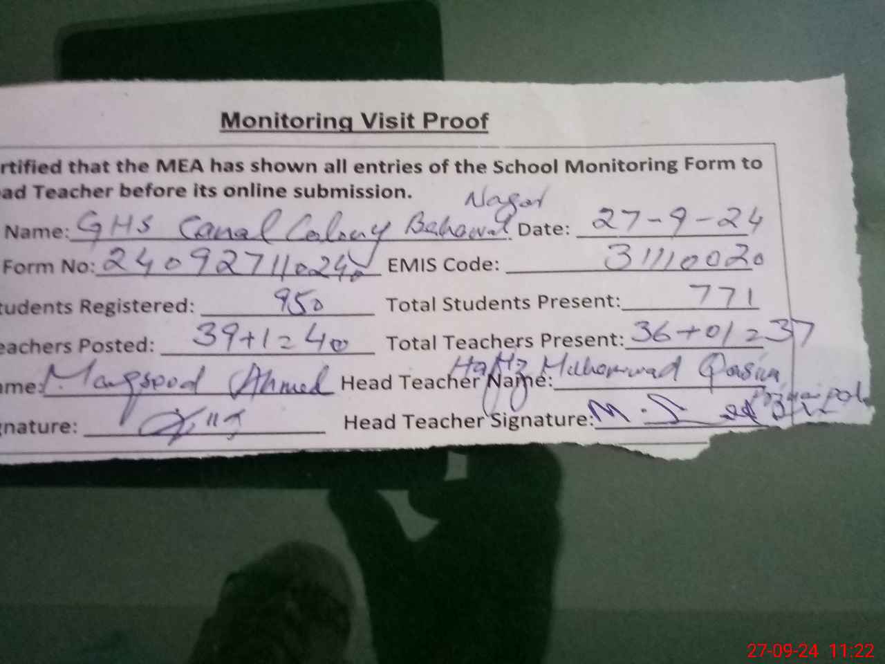 | Attendance Register | Head Teacher | MEA with School | Visit Proof |