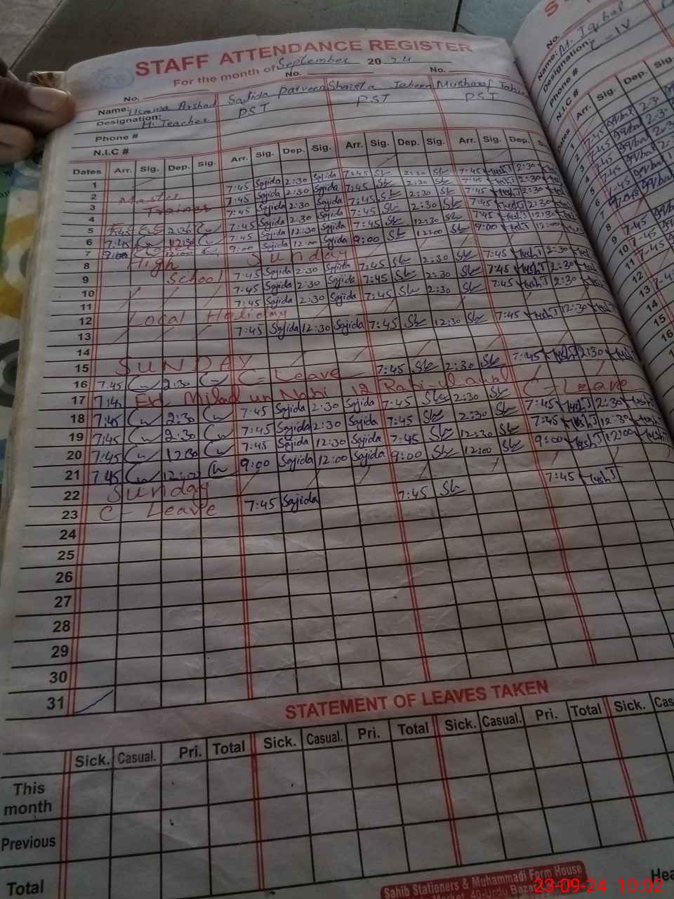 | CNIC | Full Name | Designation | R/C | Absence During Last Calender Month |