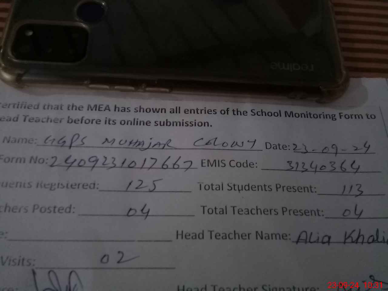 | Attendance Register | Head Teacher | MEA with School | Visit Proof |