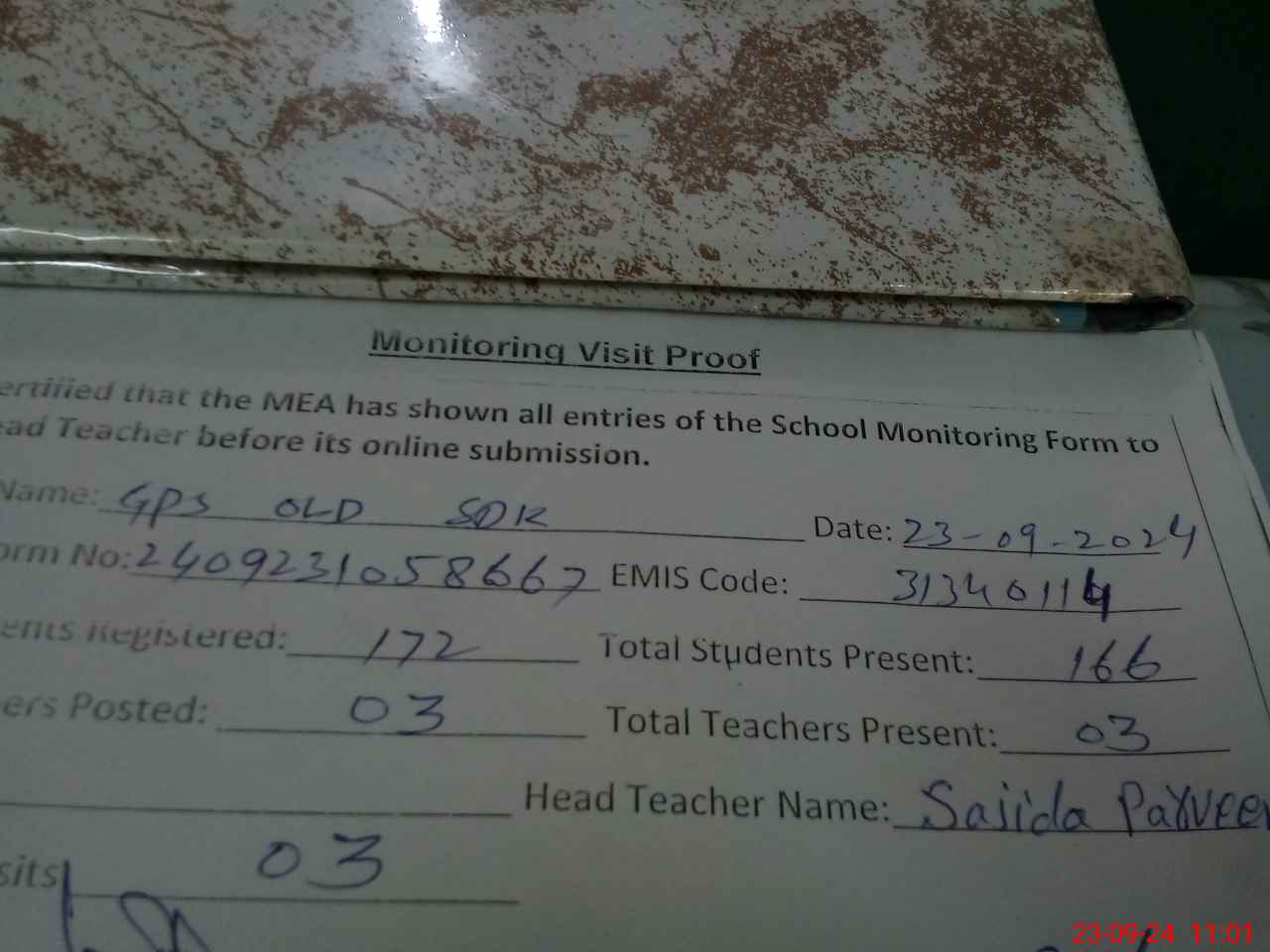 | Attendance Register | Head Teacher | MEA with School | Visit Proof |