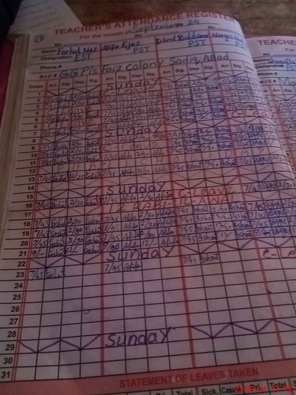| CNIC | Full Name | Designation | R/C | Absence During Last Calender Month |