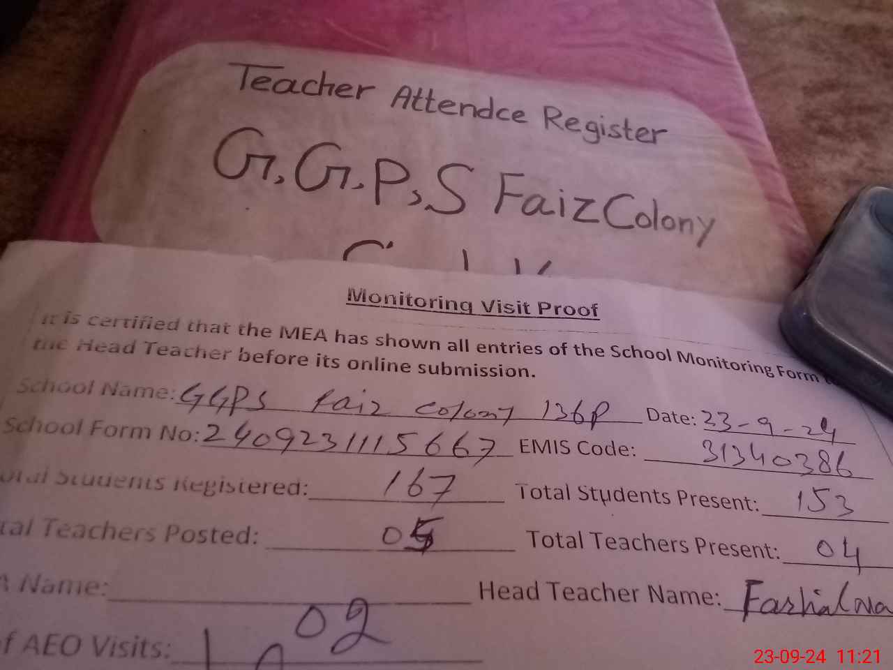 | Attendance Register | Head Teacher | MEA with School | Visit Proof |