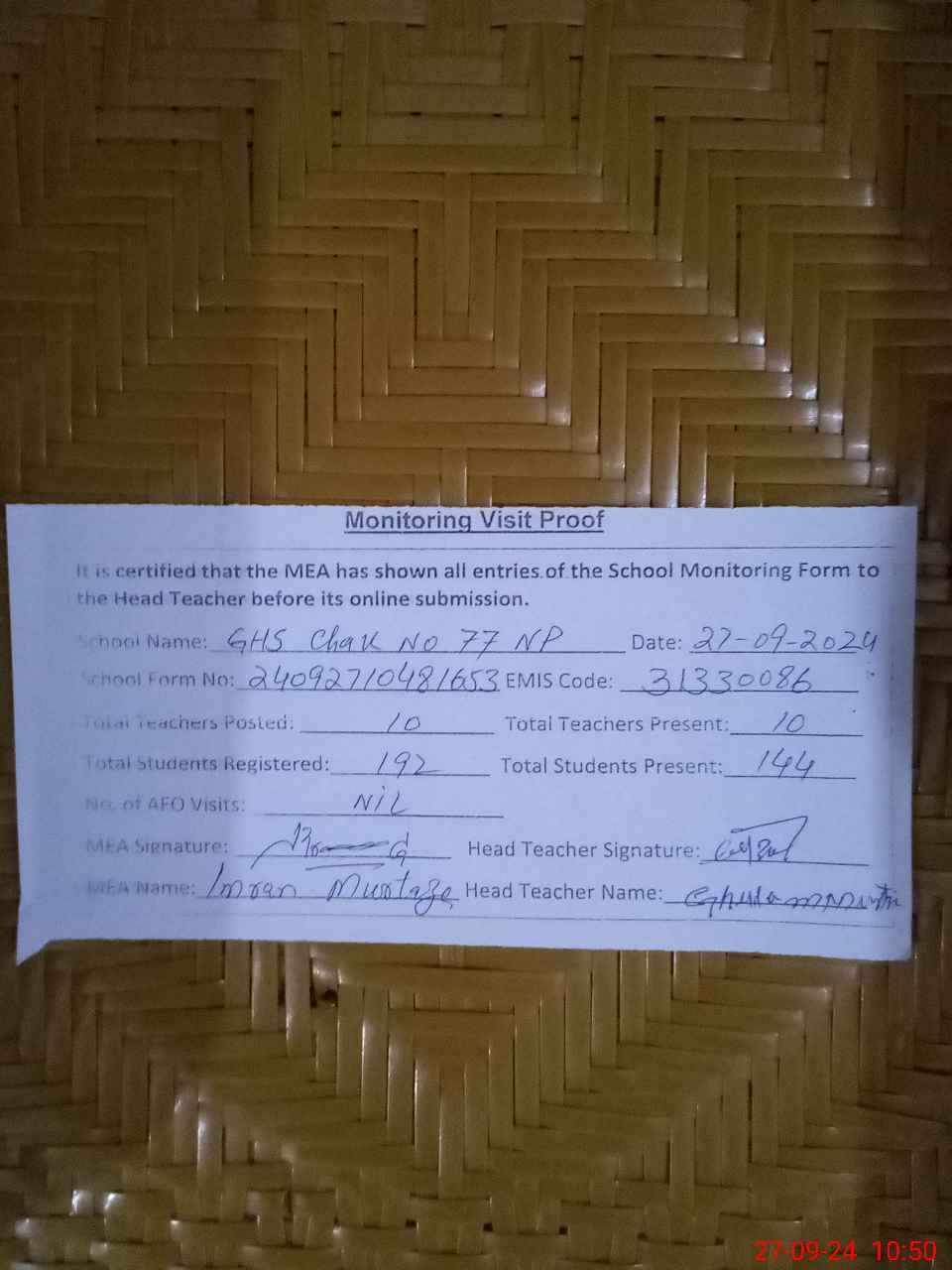 | Attendance Register | Head Teacher | MEA with School | Visit Proof |