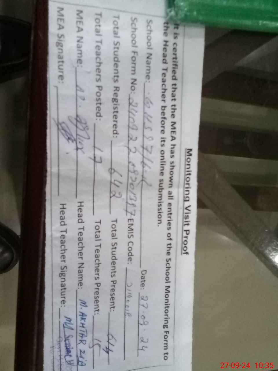 | Attendance Register | Head Teacher | MEA with School | Visit Proof |