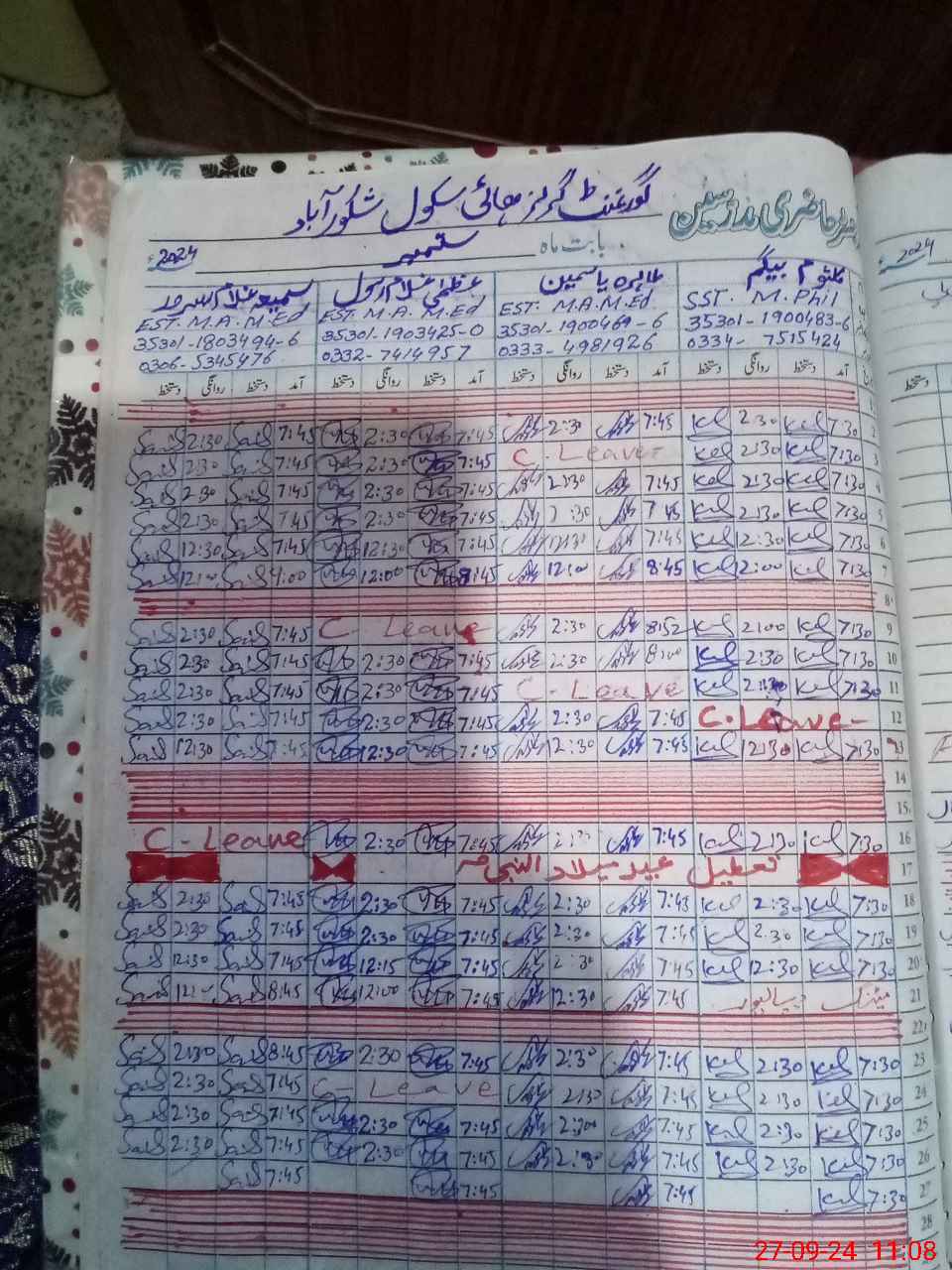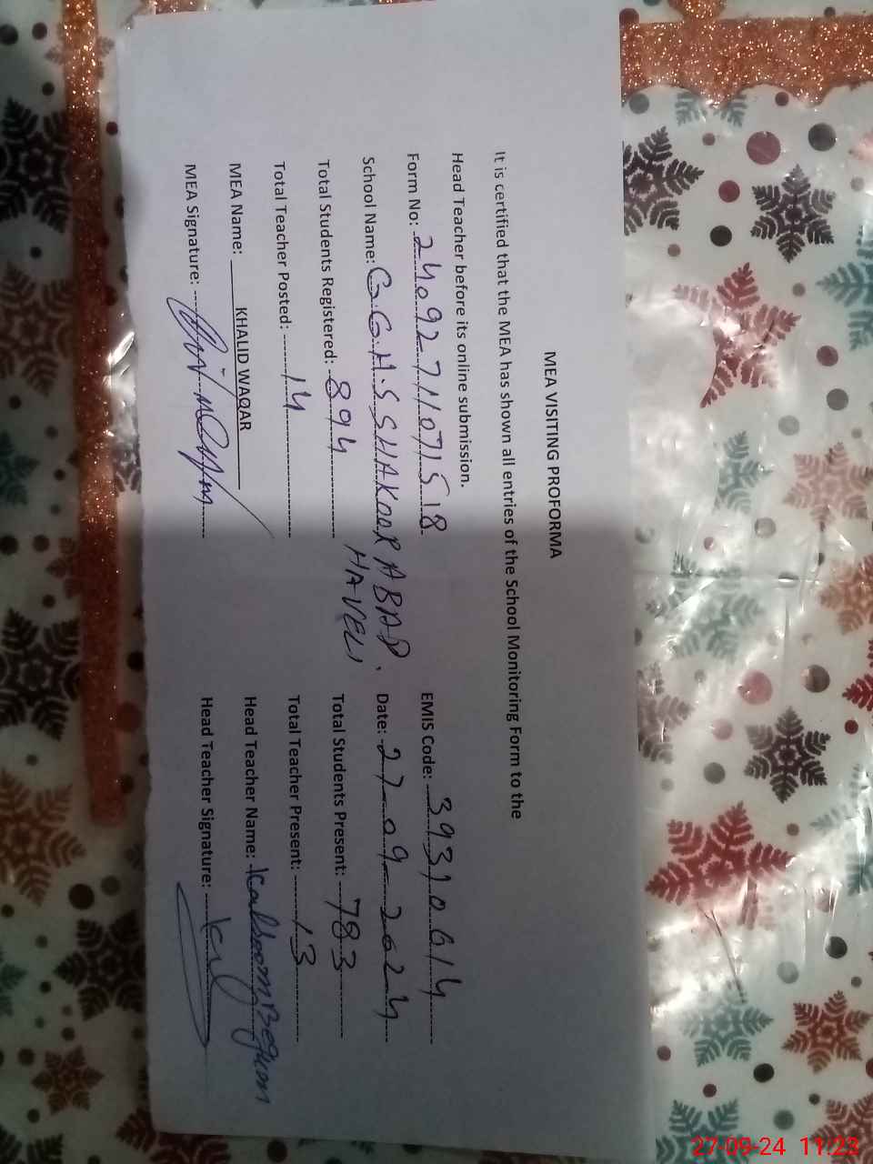 | Name: KA**** BE**** Designation: (School Headmaster's/Headmistress's) S.S.T.(Arts) Phone/Cell Number: 03**** |