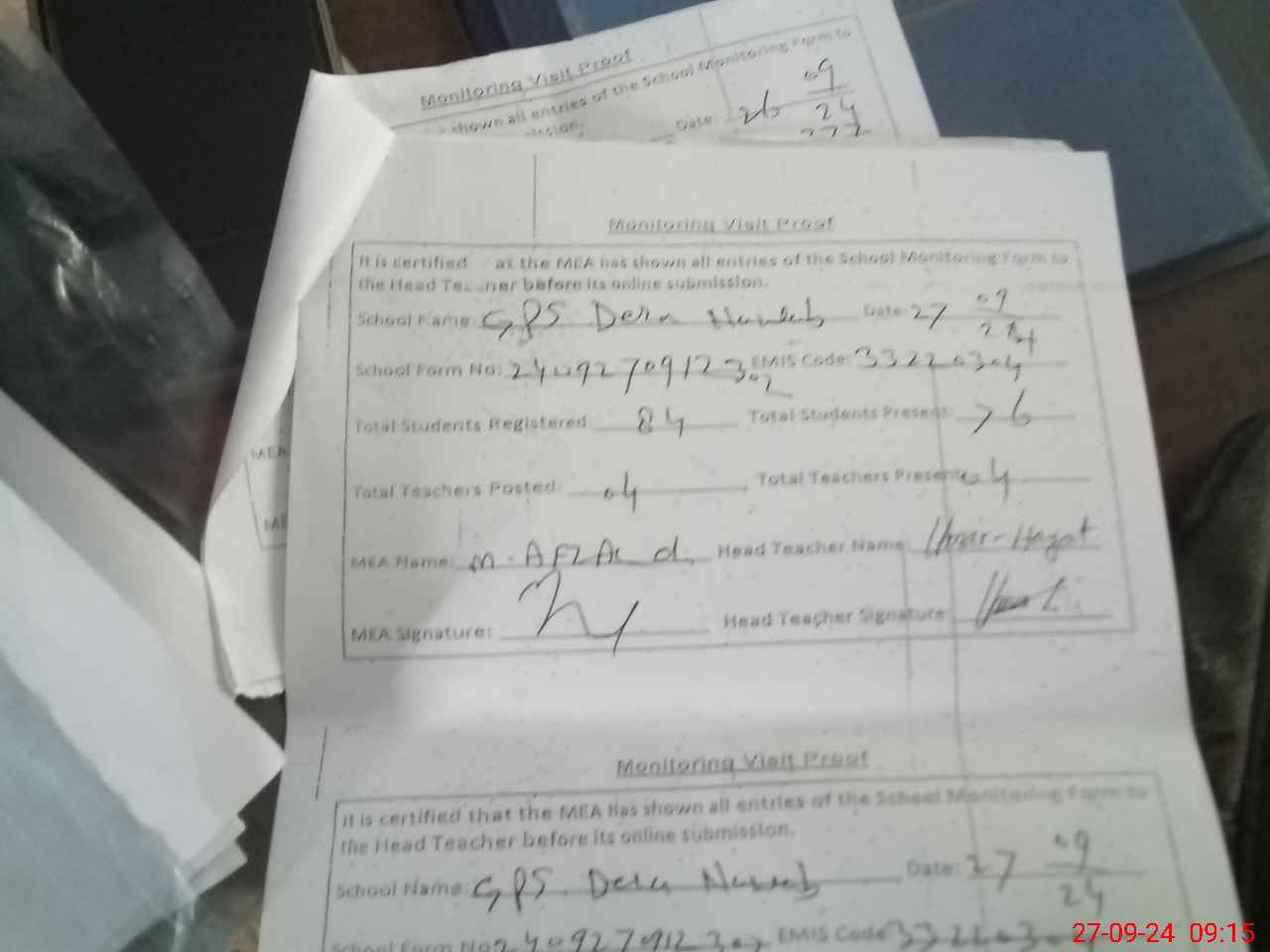 | Attendance Register | Head Teacher | MEA with School | Visit Proof |