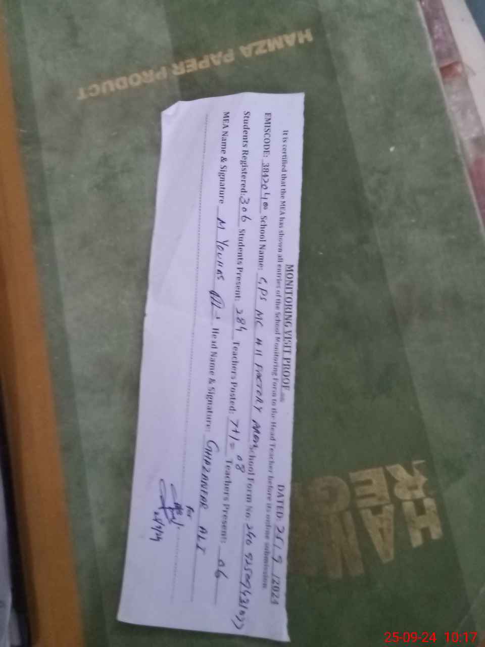 | Attendance Register | Head Teacher | MEA with School | Visit Proof |