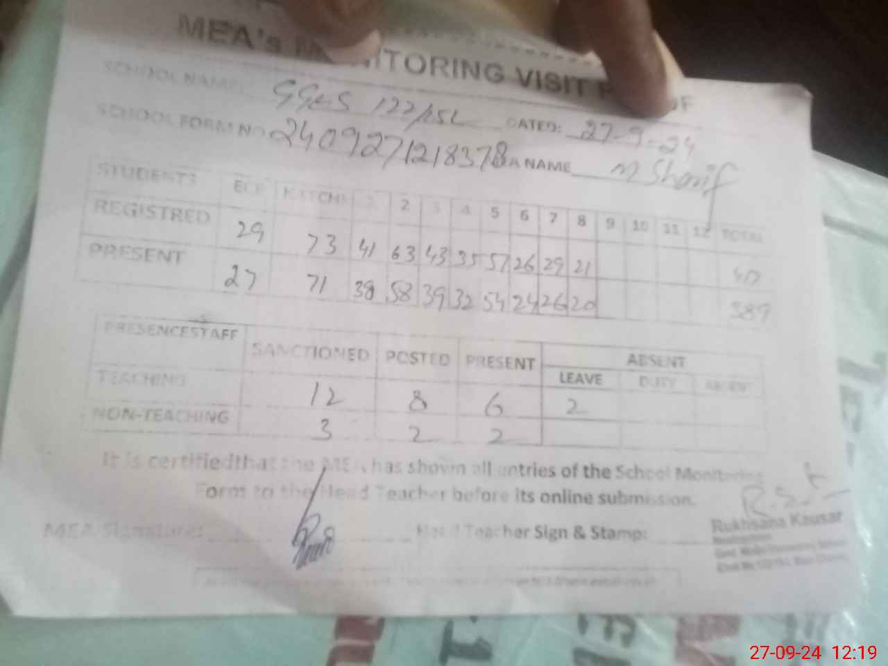 | Name: RU**** KA**** Designation: (School Headmaster's/Headmistress's) S.S.T (GENERAL) Phone/Cell Number: 03**** |