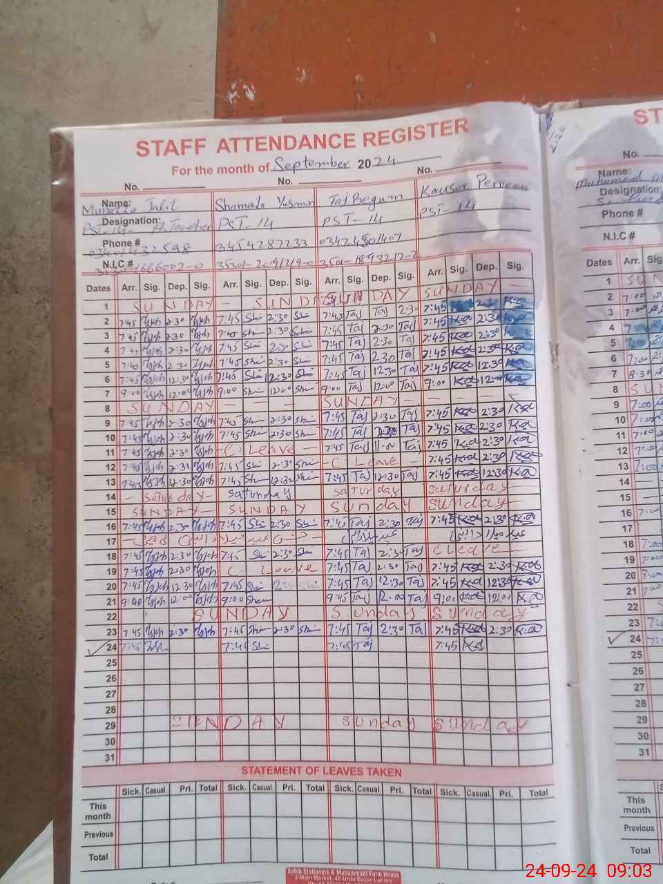 | CNIC | Full Name | Designation | R/C | Absence During Last Calender Month |