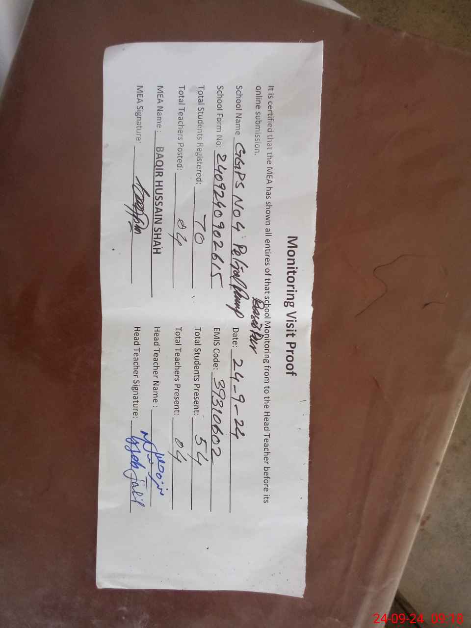 | Attendance Register | Head Teacher | MEA with School | Visit Proof |