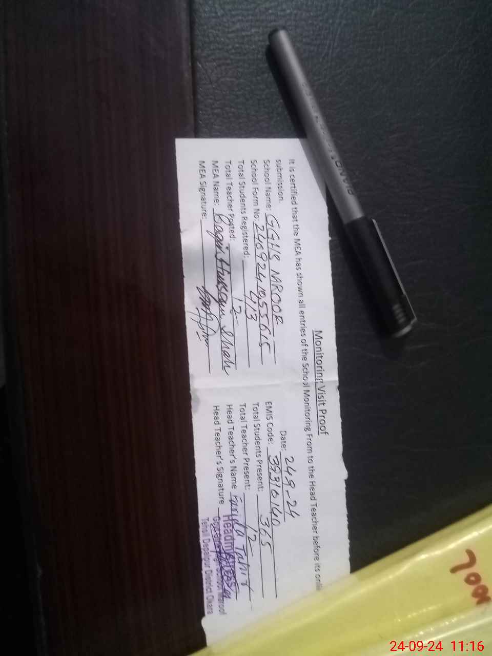 | Attendance Register | Head Teacher | MEA with School | Visit Proof |