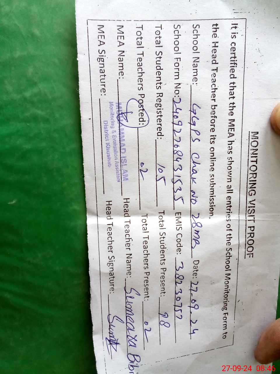 | EMIS Code: 38230757 | Name of School: GGPS CHAK NO 28 MB | |||