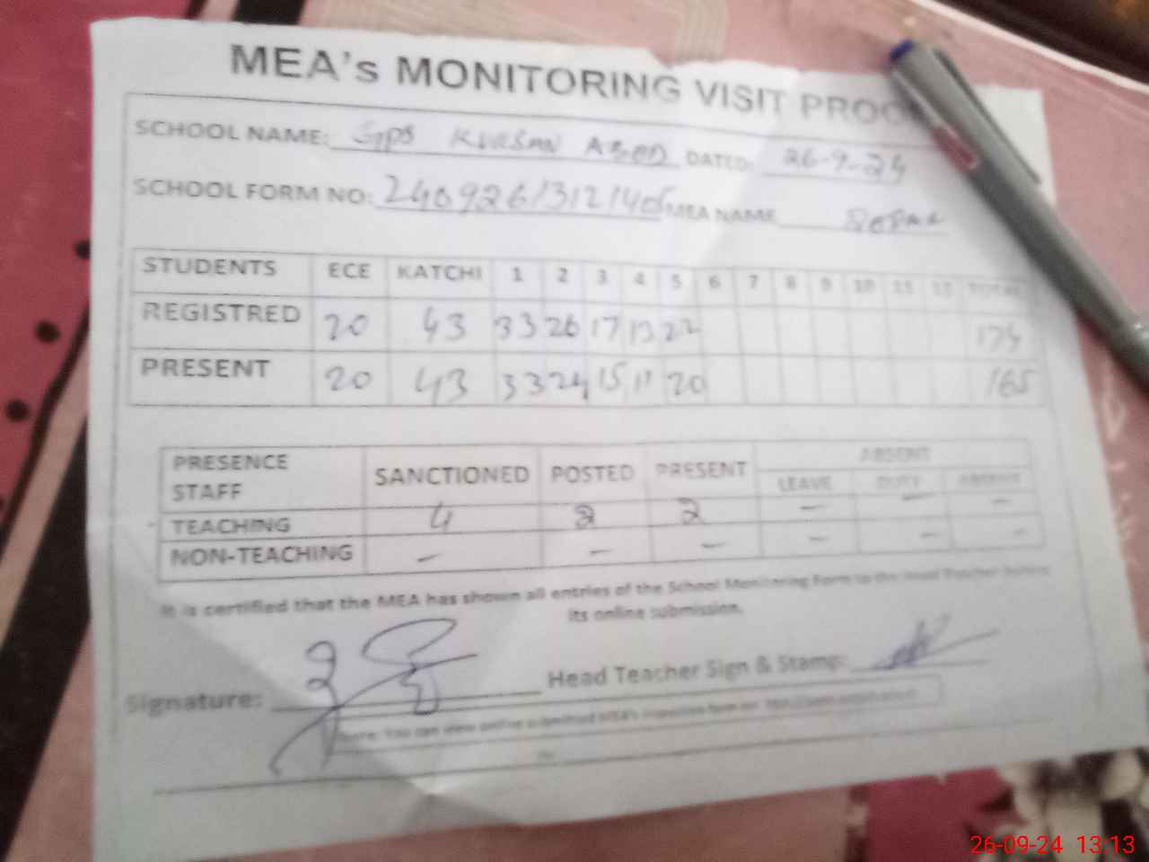 | Attendance Register | Head Teacher | MEA with School | Visit Proof |