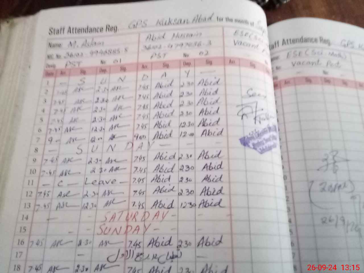 | CNIC | Full Name | Designation | R/C | Absence During Last Calender Month |