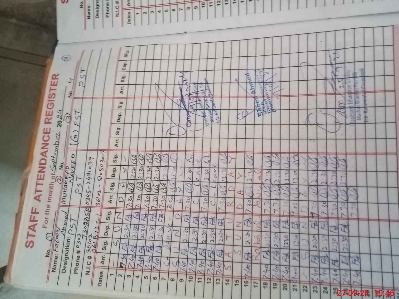 | CNIC | Full Name | Designation | R/C | Absence during last cal. month |