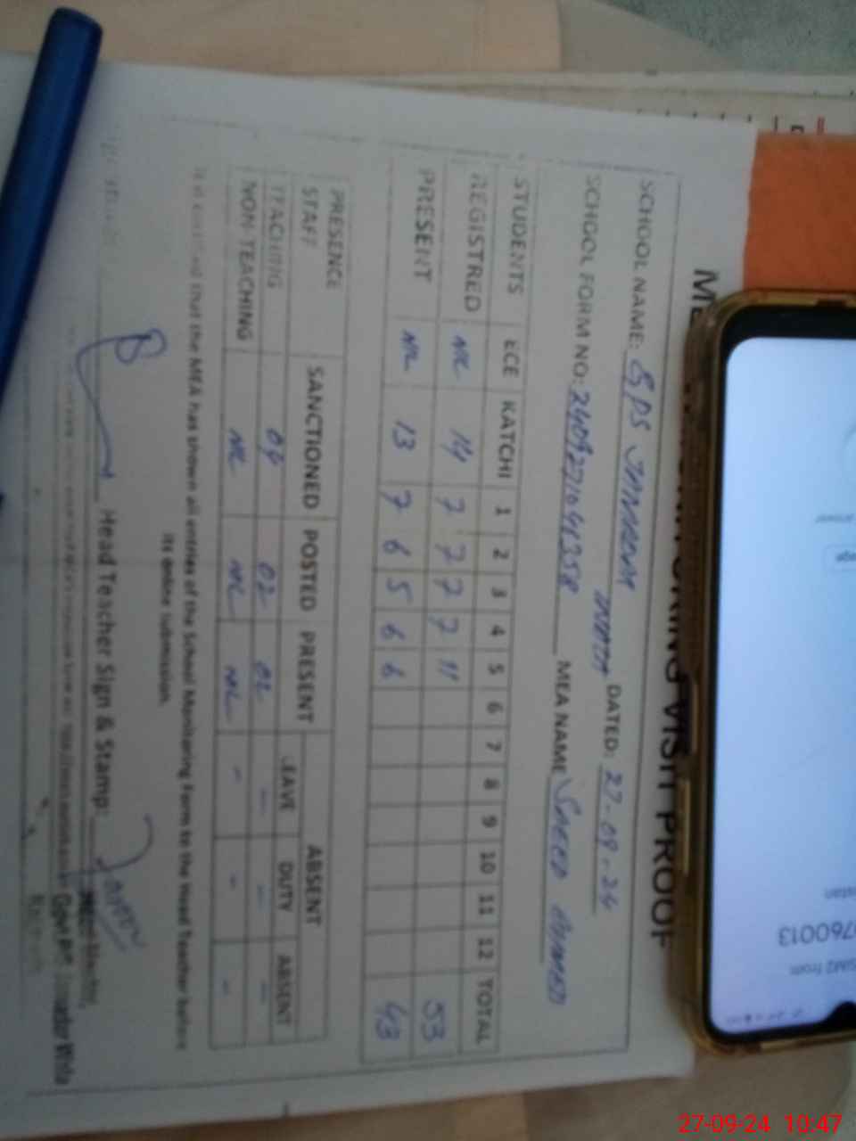 | Attendance Register | Head Teacher | MEA with School | Visit Proof |