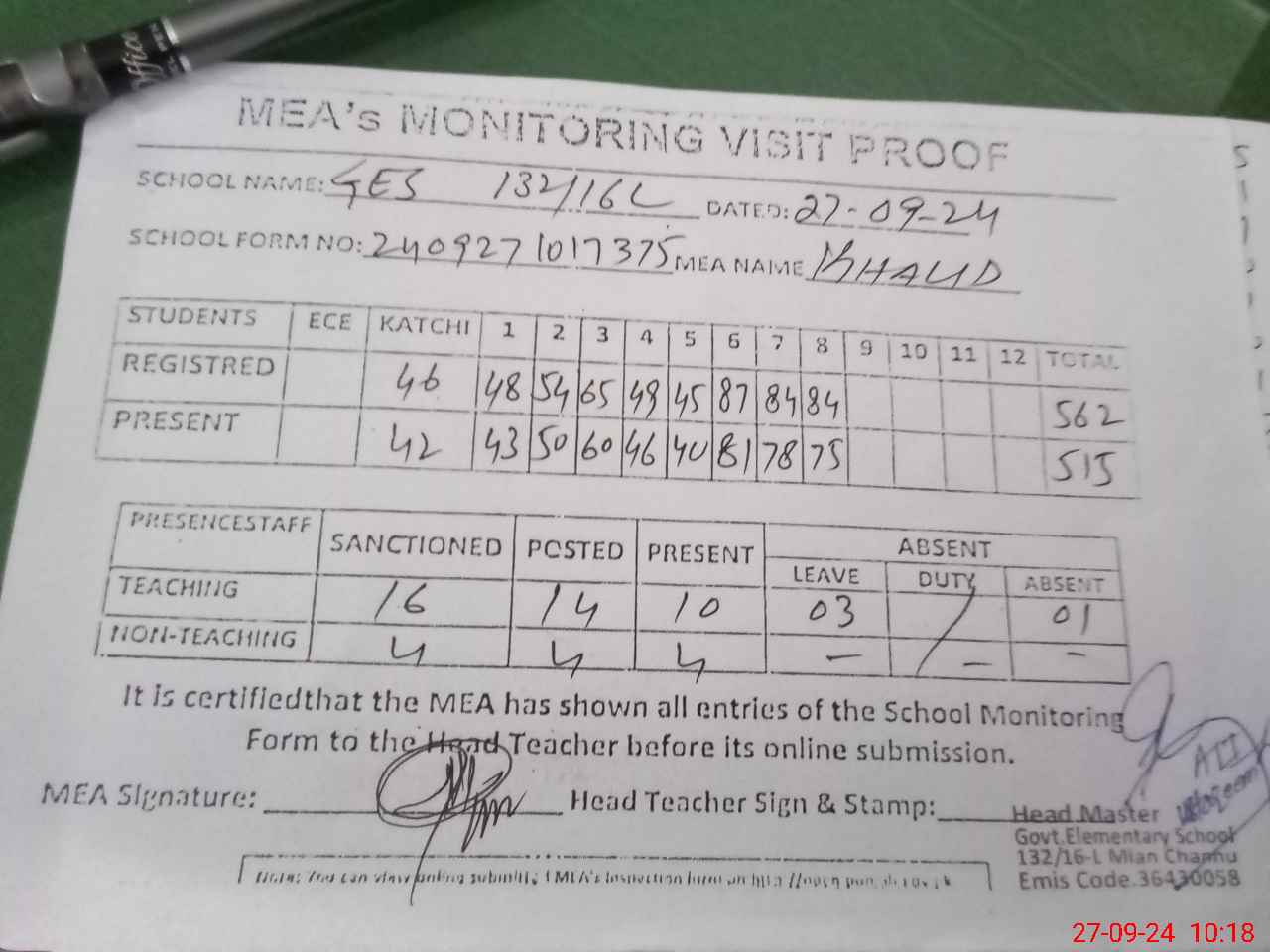 | EMIS Code: 36430058 | Name of School: GES 132/16-L, MIAN CHANNU | |||