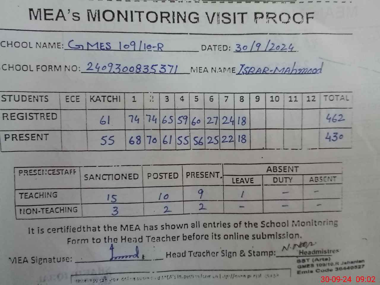| Attendance Register | Head Teacher | MEA with School | Visit Proof |