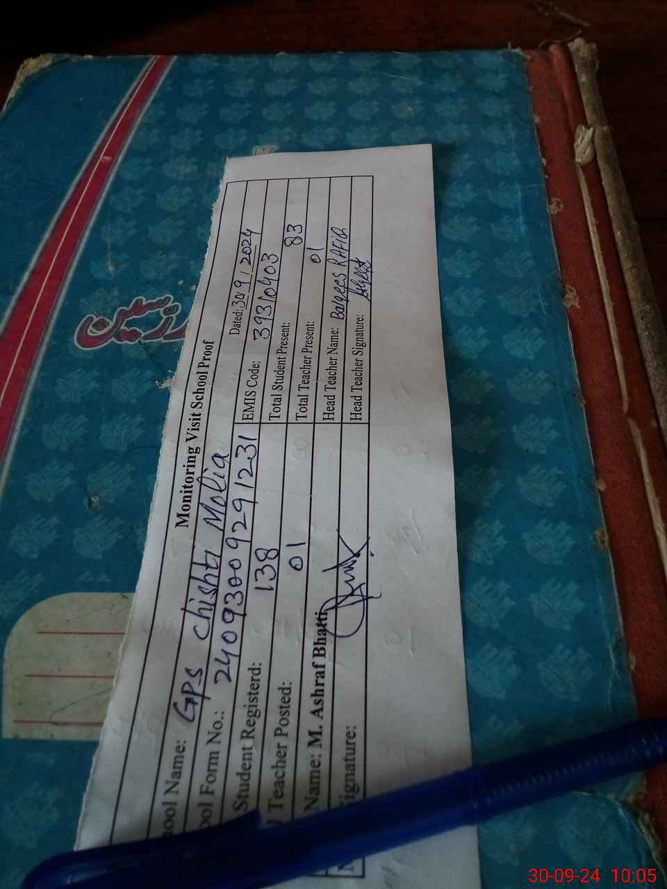 | EMIS Code: 39310403 | Name of School: GPS CHISHTI MOLIA | |||