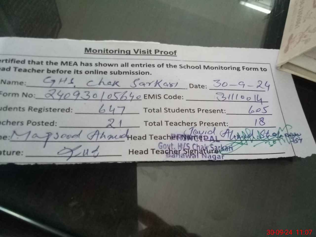 | Attendance Register | Head Teacher | MEA with School | Visit Proof |