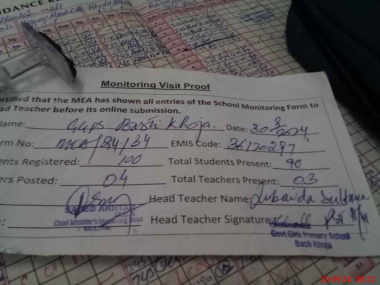 | Attendance Register | Head Teacher | MEA with School | Visit Proof |