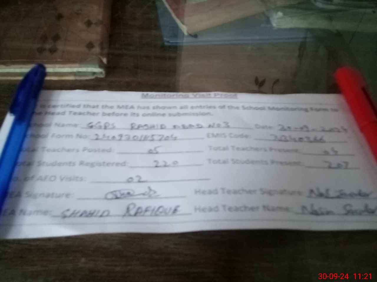 | Attendance Register | Head Teacher | MEA with School | Visit Proof |