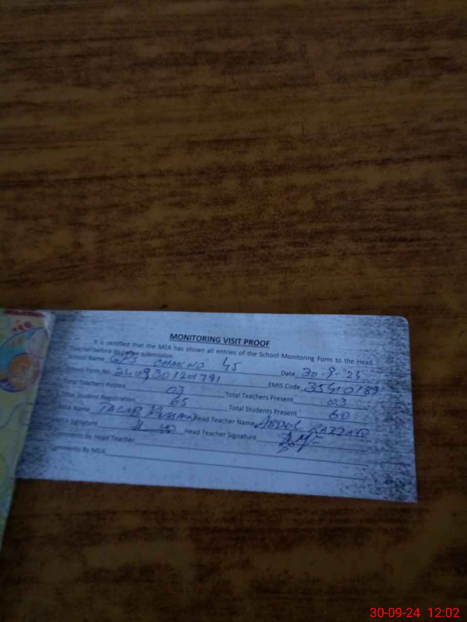 | Attendance Register | Head Teacher | MEA with School | Visit Proof |