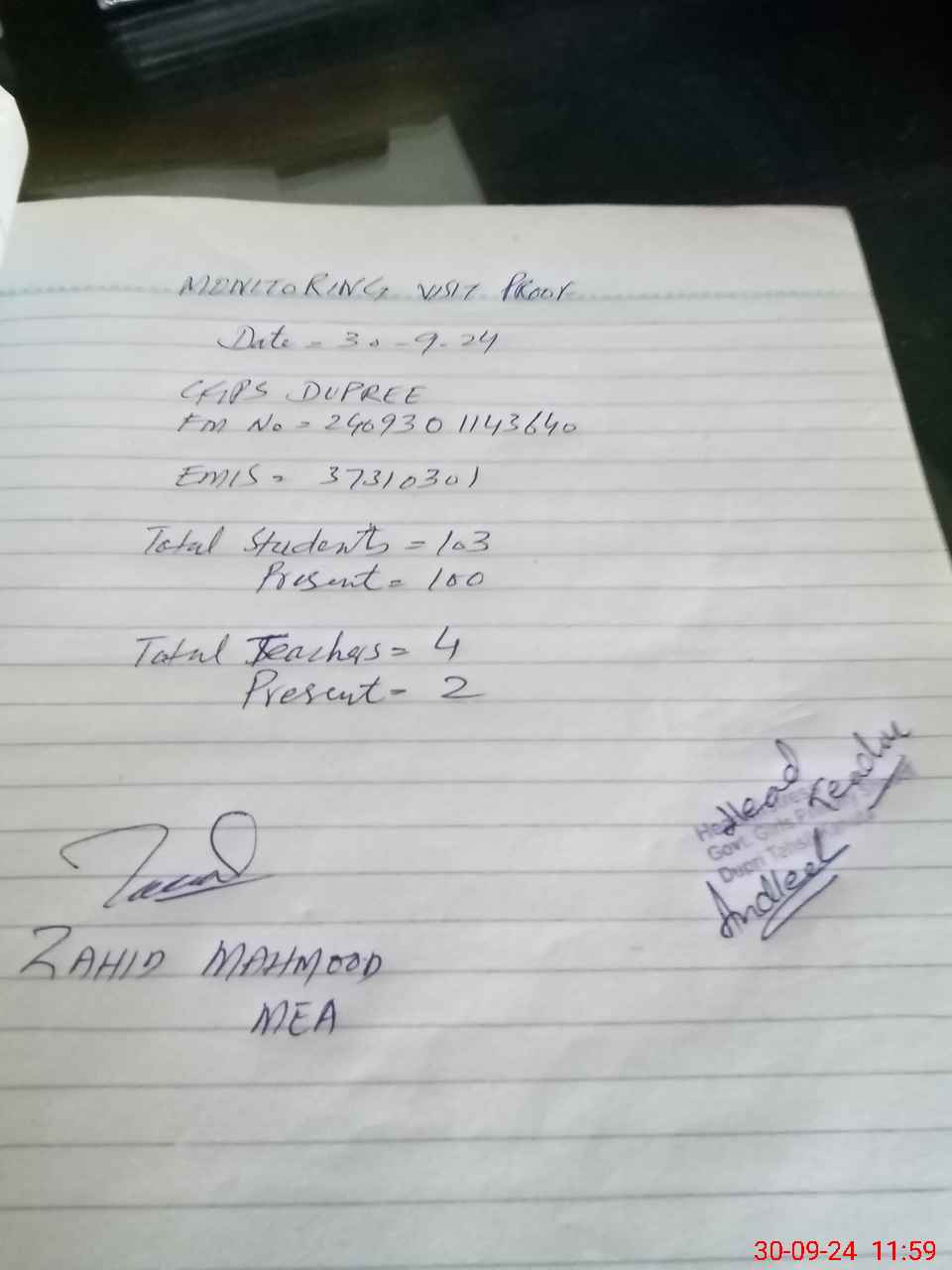 | Remarks (Use Separate Page if Required): Head teacher Miss Andleeb Rashid represented a private girl Miss Sidra Hassan as Miss Ayesha Hassan PST who is not present in the school | |||||
