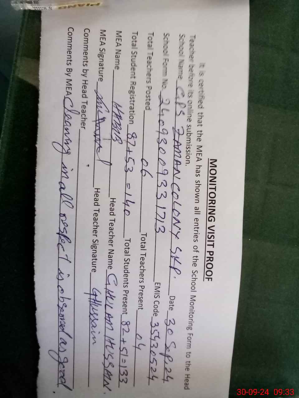 | Attendance Register | Head Teacher | MEA with School | Visit Proof |