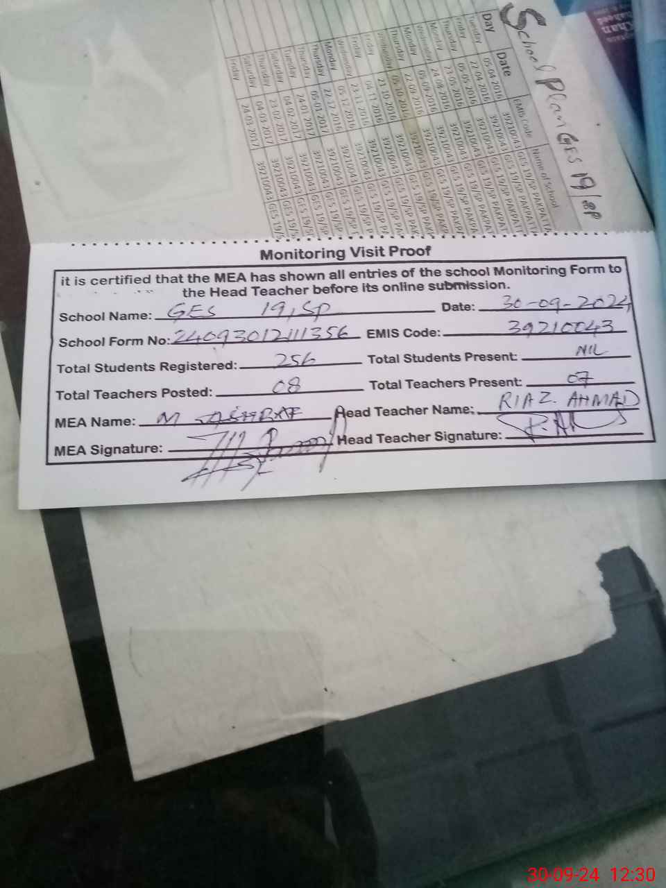 | Attendance Register | Head Teacher | MEA with School | Visit Proof |