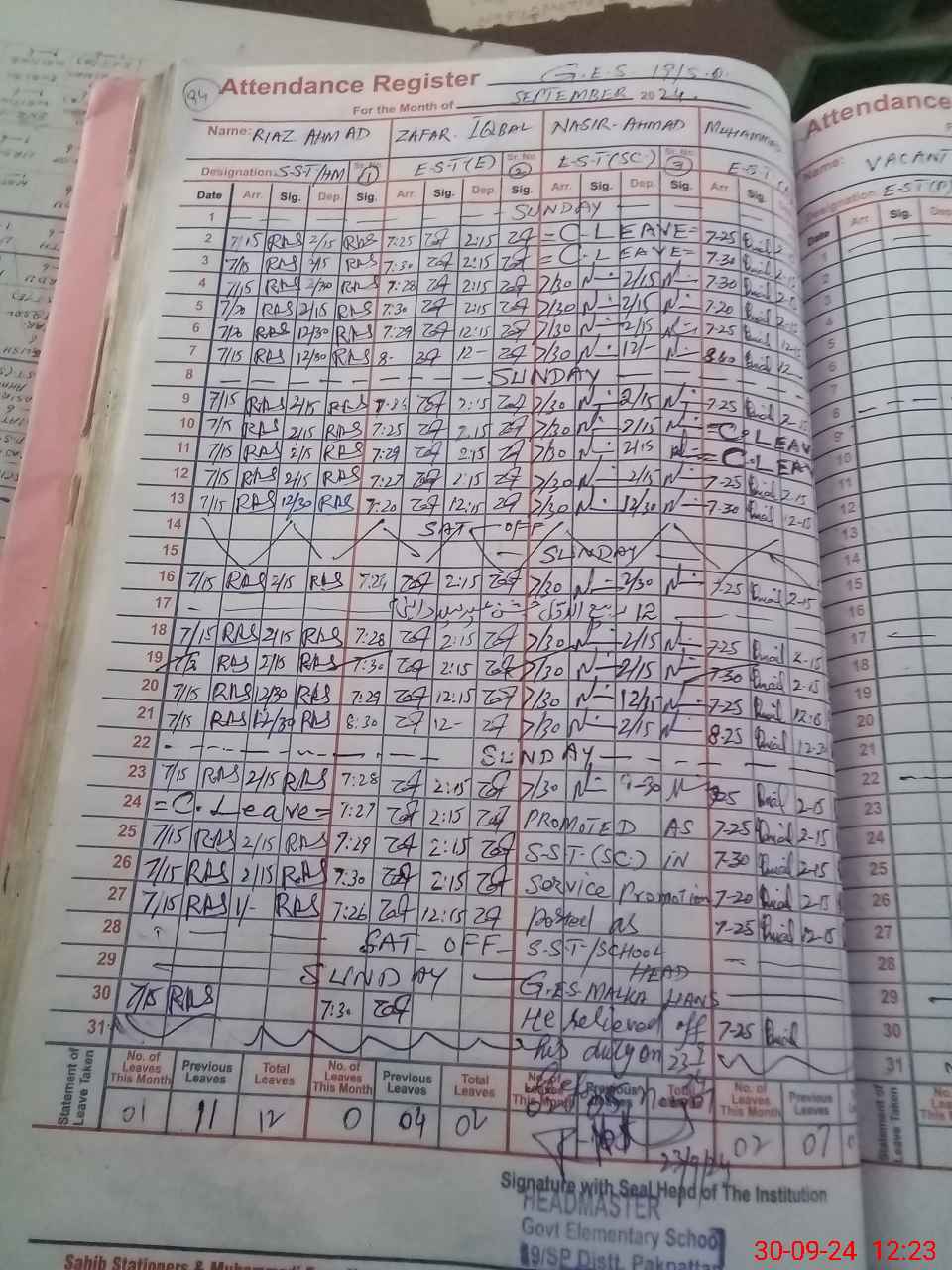 | Name: RI**** AH**** Designation: (School Headmaster's/Headmistress's) SST (GENERAL) Phone/Cell Number: 03**** |