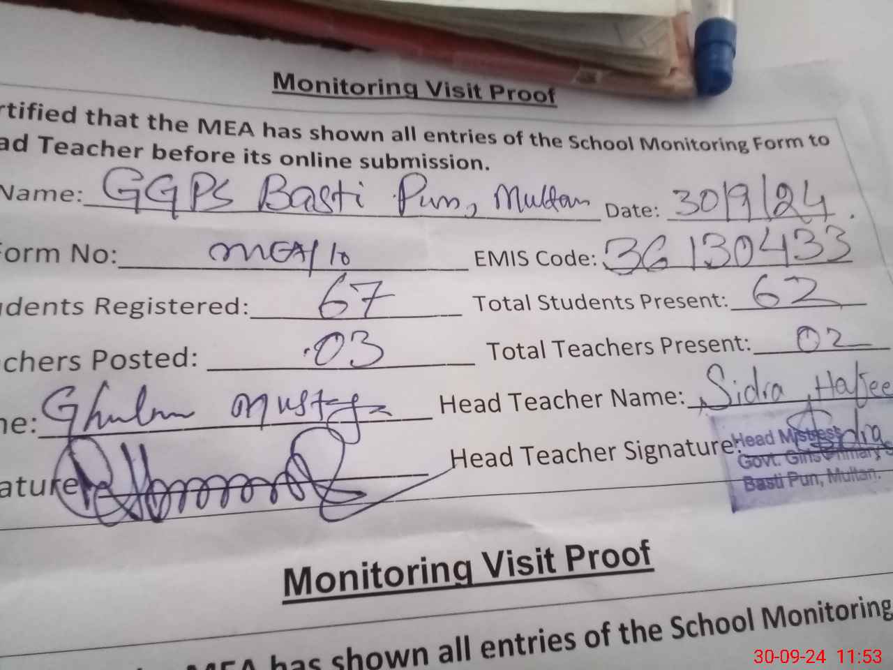 | Attendance Register | Head Teacher | MEA with School | Visit Proof |