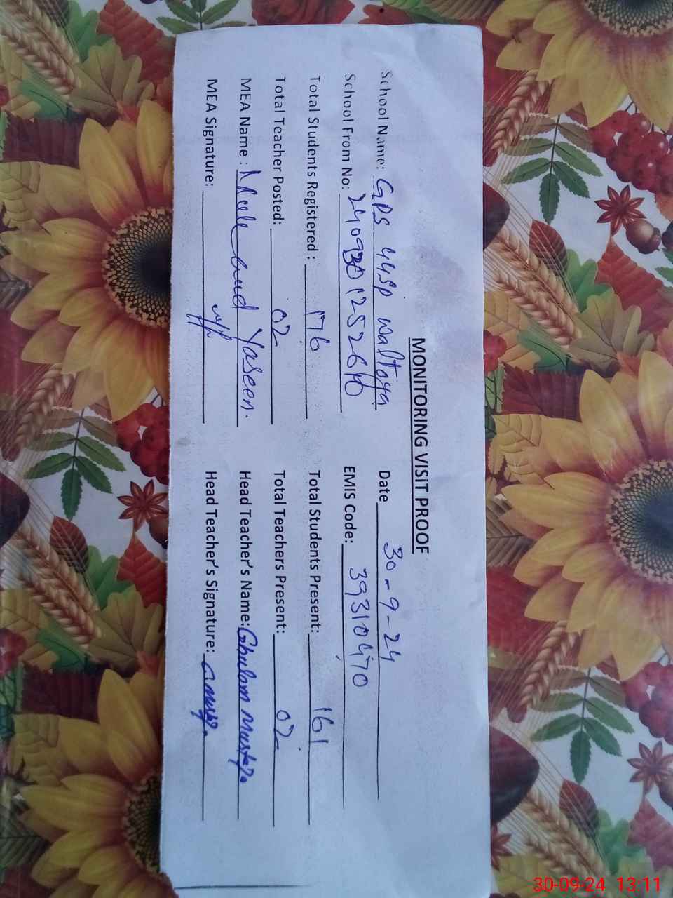 | Attendance Register | Head Teacher | MEA with School | Visit Proof |