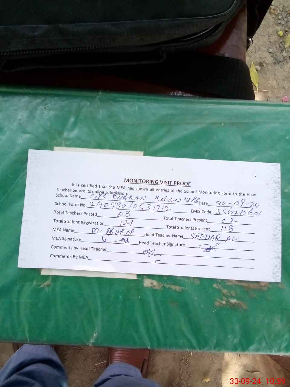 | EMIS Code: 35620601 | Name of School: GPS DHABAN KALAN CHAK NO.13/RB | |||