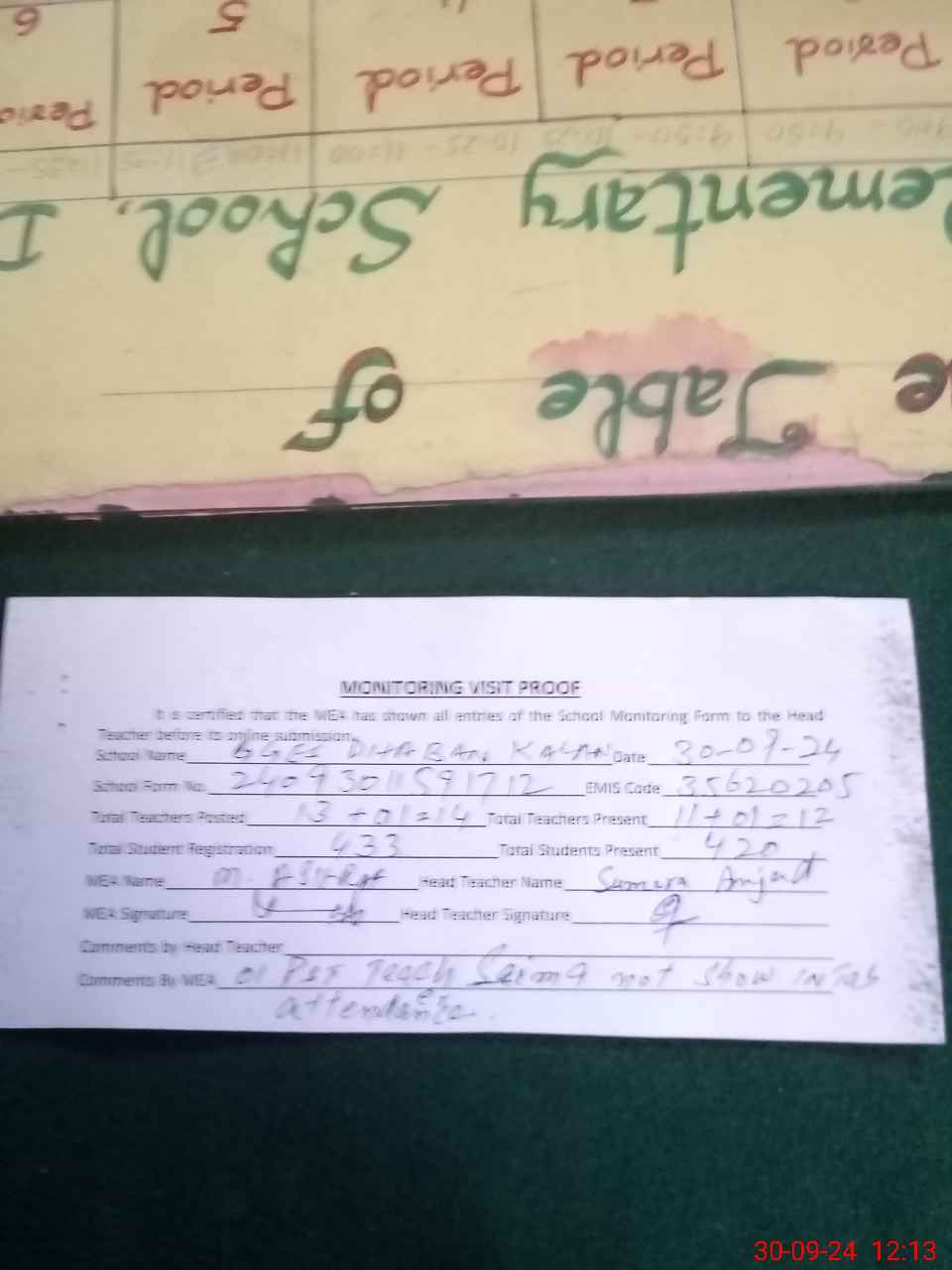 | Attendance Register | Head Teacher | MEA with School | Visit Proof |