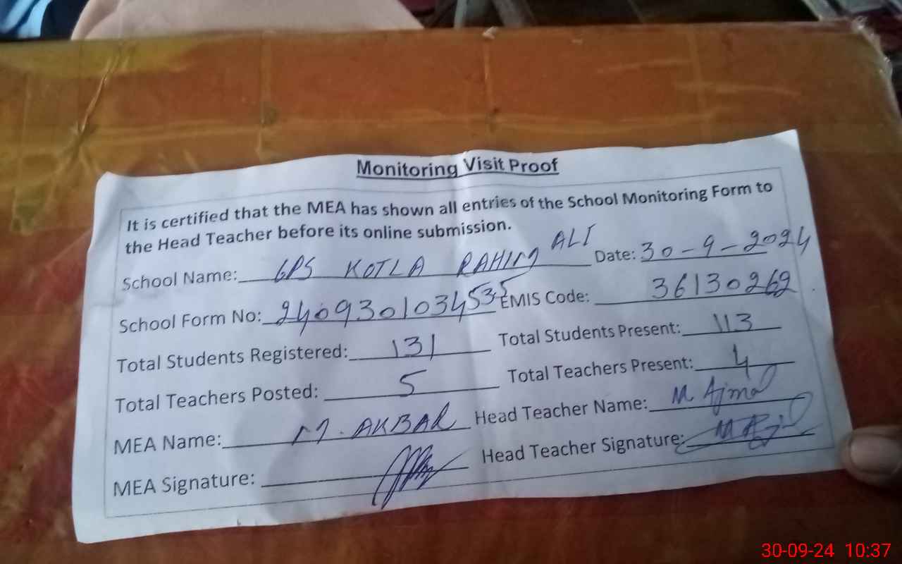 | EMIS Code: 36130262 | Name of School: GPS KOTLA RAHAM ALI LAR MULTAN | |||