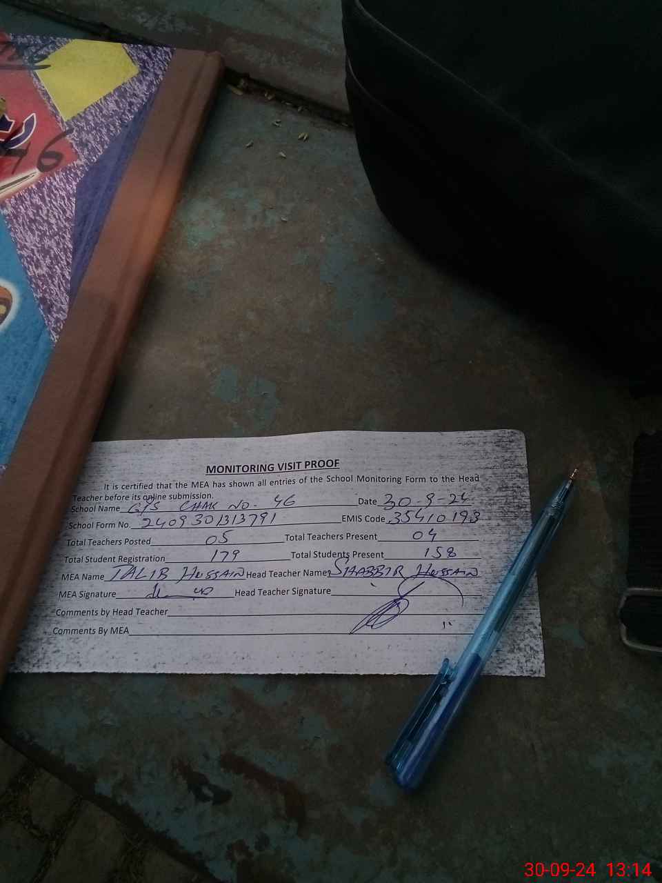 | Attendance Register | Head Teacher | MEA with School | Visit Proof |