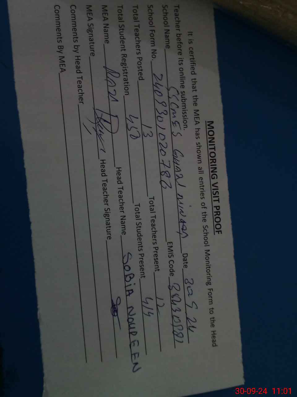 | Attendance Register | Head Teacher | MEA with School | Visit Proof |