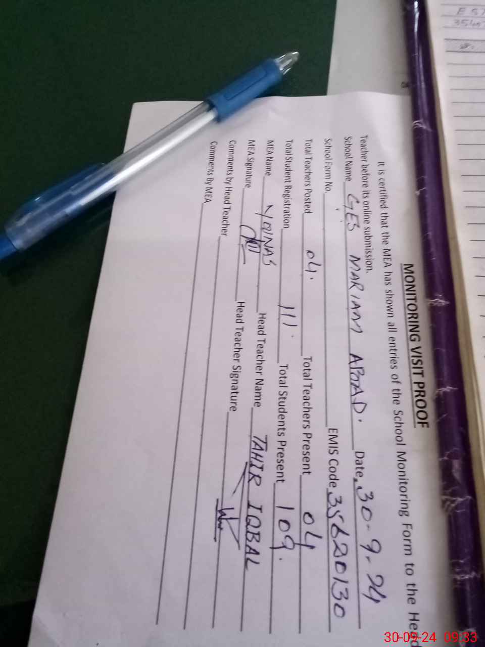 | Attendance Register | Head Teacher | MEA with School | Visit Proof |