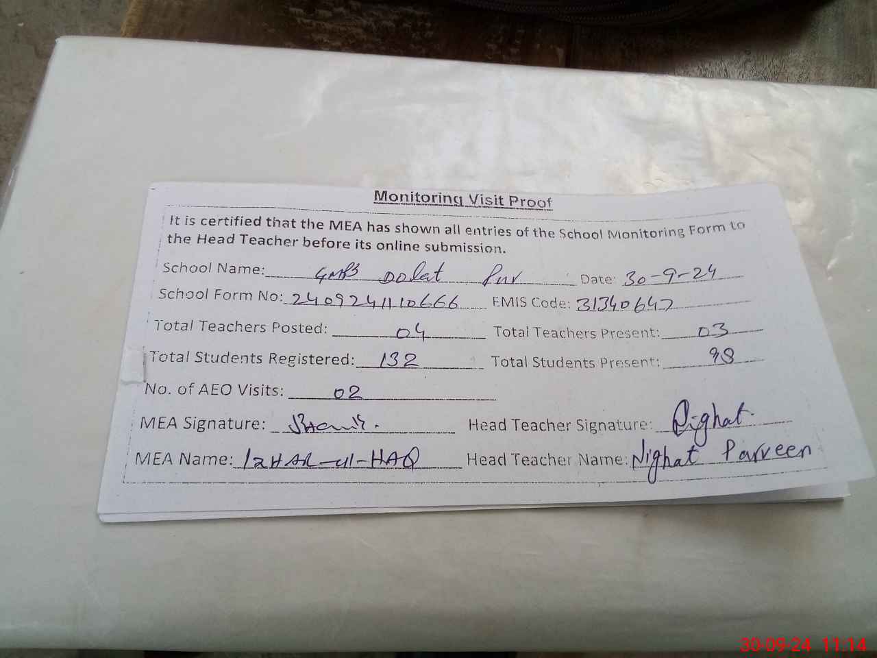 | Attendance Register | Head Teacher | MEA with School | Visit Proof |