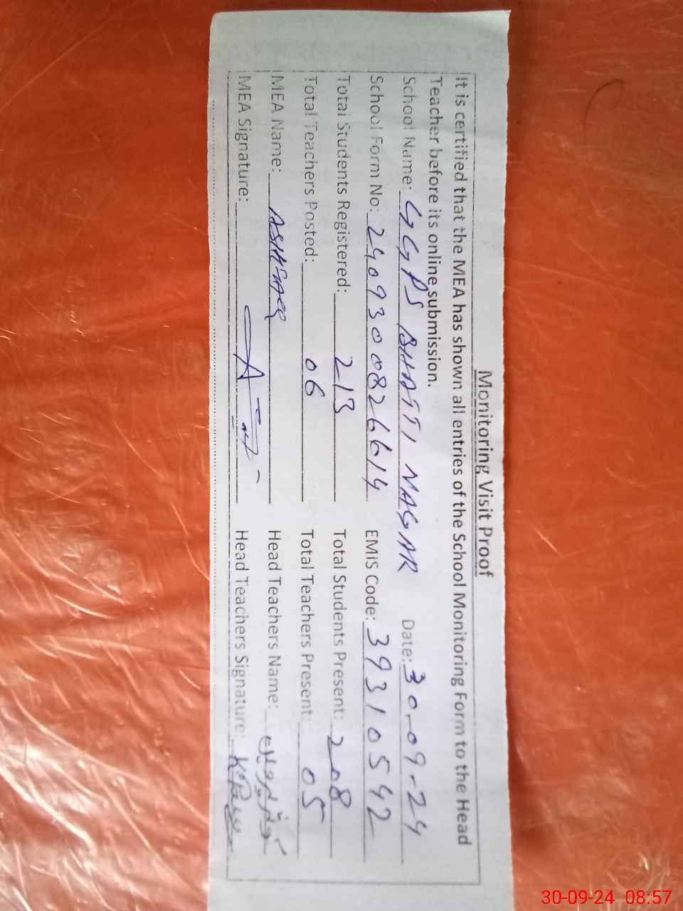 | Attendance Register | Head Teacher | MEA with School | Visit Proof |