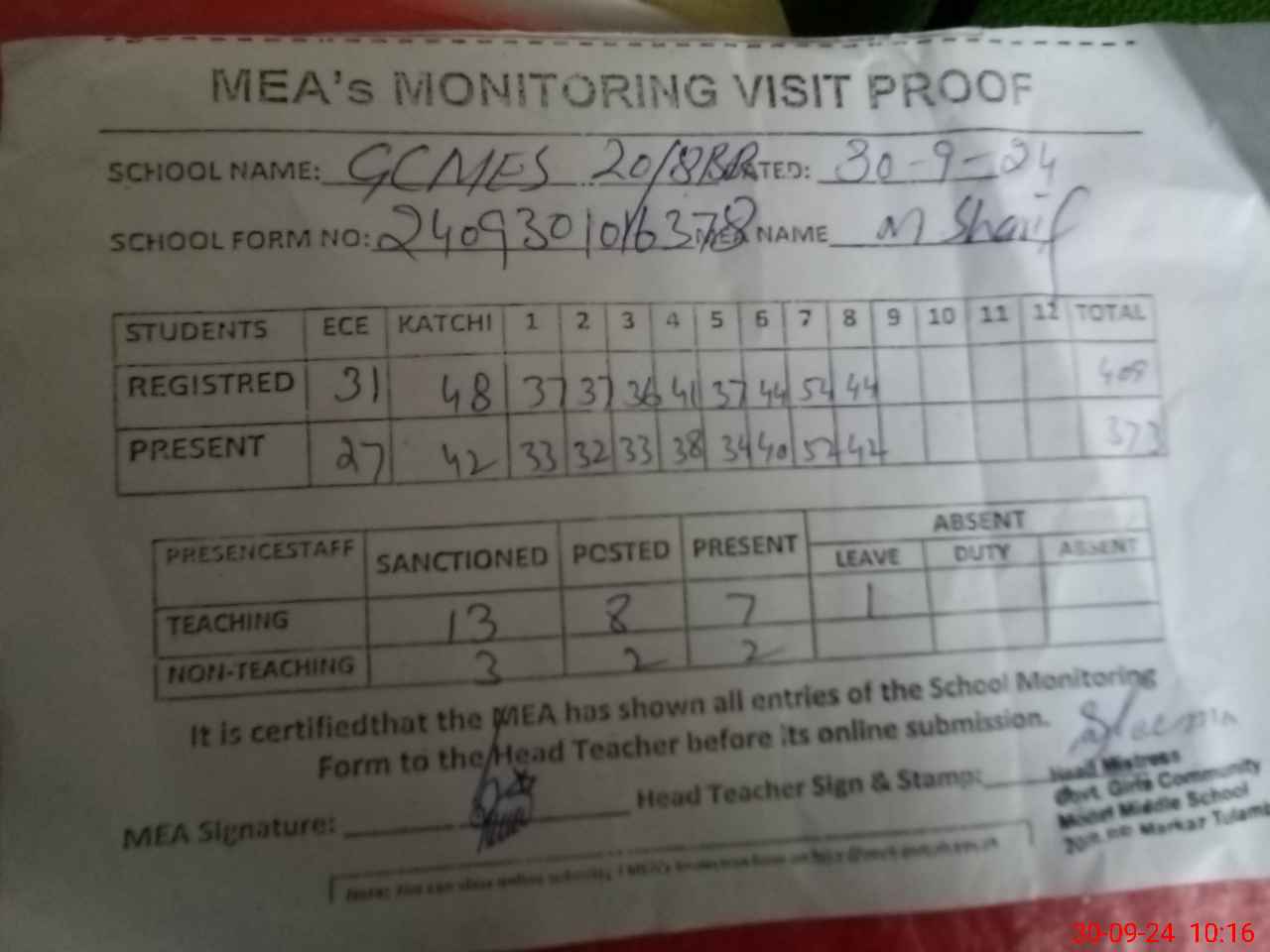 | Attendance Register | Head Teacher | MEA with School | Visit Proof |