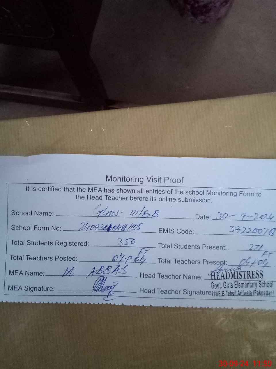| EMIS Code: 39220078 | Name of School: GGES 111 EB P.O.ARIFWALA | |||
